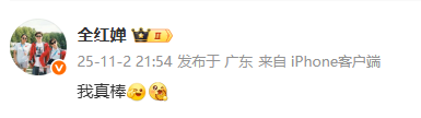11月2日,全红婵伤愈首秀夺冠,赛后发文:“我真棒”。
